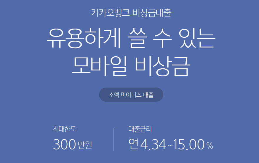카카오뱅크 비상금대출은 최대 300만 원까지 쉽고 빠르게 이용할 수 있는 모바일 전용 마이너스 통장형 소액대출입니다.